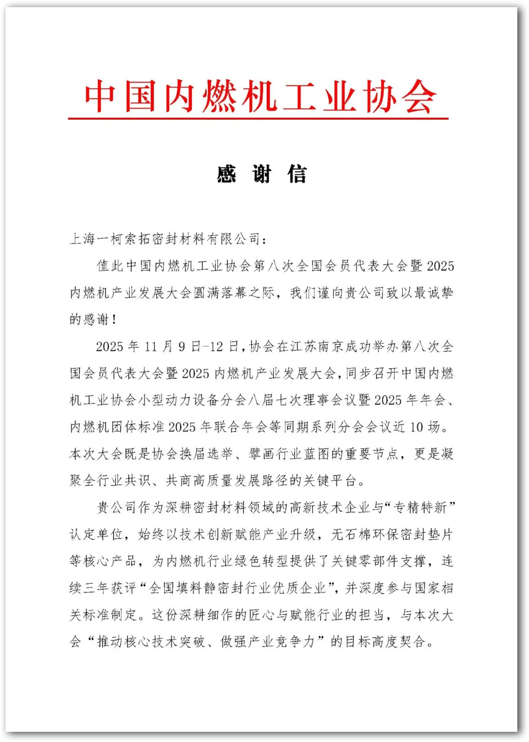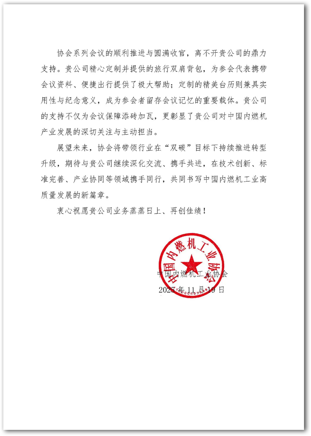 來(lái)自中國(guó)內(nèi)燃機(jī)工業(yè)協(xié)會(huì)的感謝信